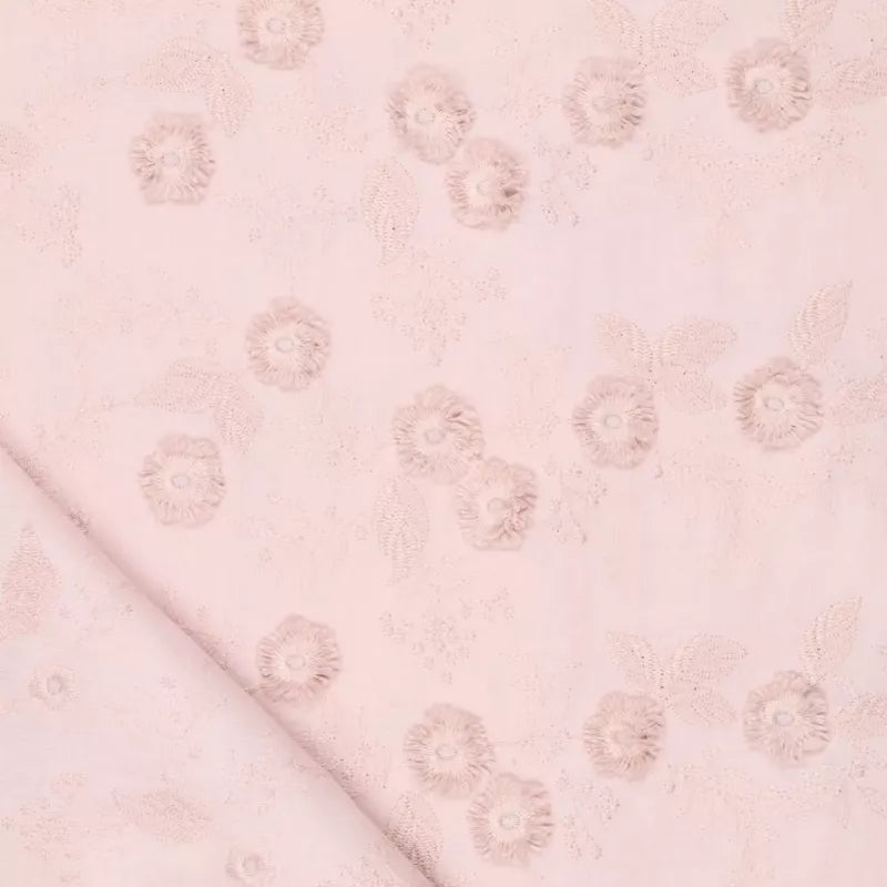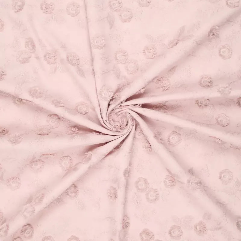 Deze roze geborduurde geweven stof per meter straalt elegantie en verfijning uit. De basis van 100% katoen voelt zacht en ademend aan, ideaal voor zomerse kleding die licht en comfortabel moet zijn. De subtiele bloemenborduursels voegen een rijke en decoratieve dimensie toe, waardoor de stof een luxe uitstraling krijgt.