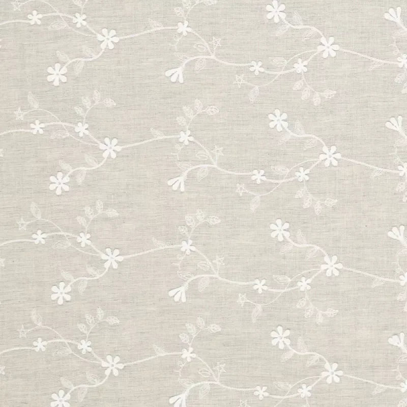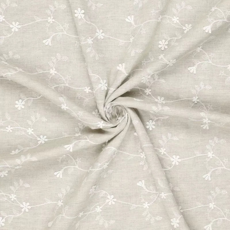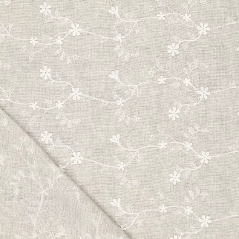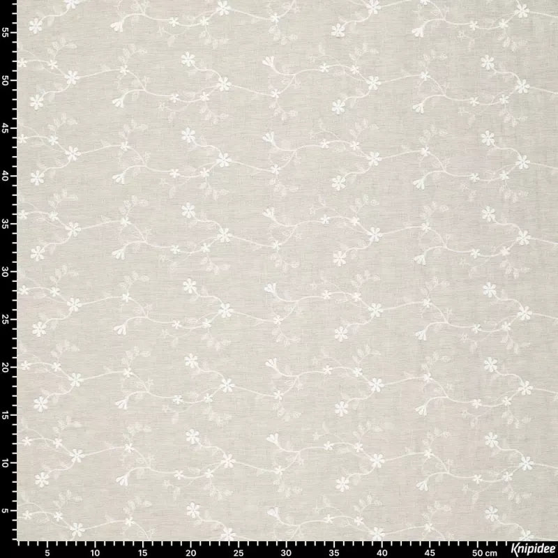 Ontdek deze verfijnde naturel geborduurde stof met een zachte, luchtige uitstraling en een elegant bloemenborduursel. De transparante, geweven basis in natuurlijke tinten wordt verrijkt met fijn borduurwerk, wat de stof een romantische en zomerse look geeft. Perfect voor lichte, vrouwelijke ontwerpen met een subtiel detail.