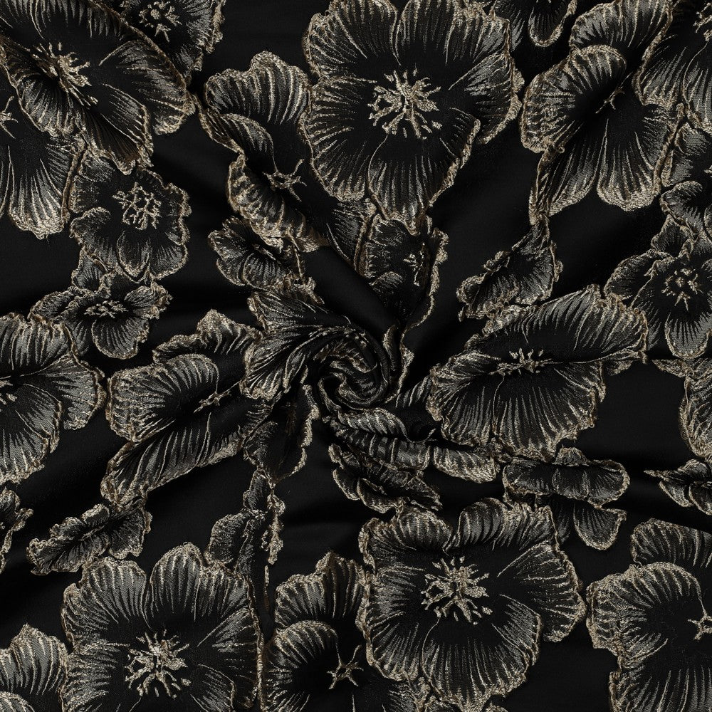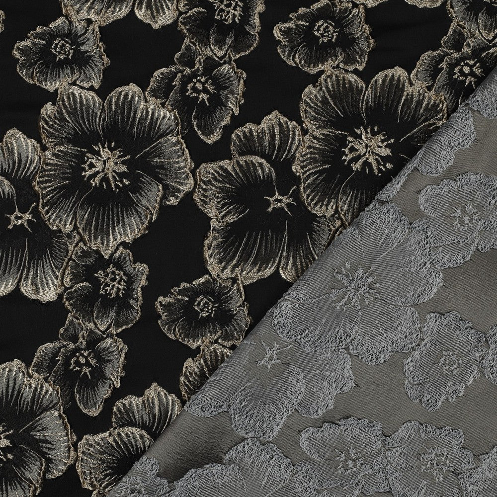 Deze zwarte jacquard stof met bloemen straalt luxe, elegantie en verfijning uit. Het ingeweven bloemendessin in licht garen creëert een prachtig contrast en geeft de stof diepte en karakter. De jacquardstructuur zorgt voor een subtiele glans en een rijk textuureffect, waardoor het dessin mooi tot leven komt.