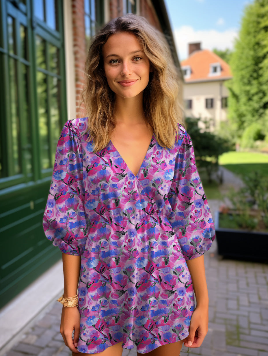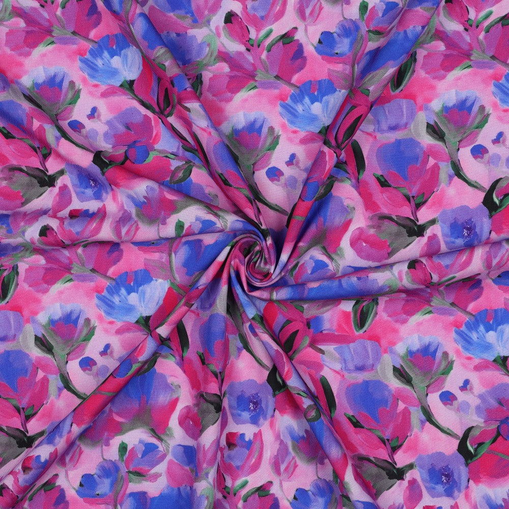 Met een gewicht van 115 gr/m² is deze stof licht en luchtig, waardoor hij prachtig valt en een elegante beweging heeft. De digitale print met diepe, volle kleuren geeft de stof een chique en moderne uitstraling die geschikt is voor zowel casual als meer geklede ontwerpen.