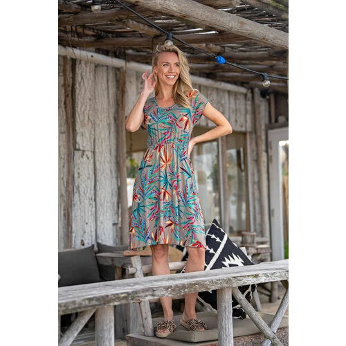 De jurk kan worden gemaakt in verschillende stoffen zoals katoen, viscose, linnen of andere soepele jurkstoffen. Hierdoor kun je eenvoudig variëren in stijl, print en seizoen.