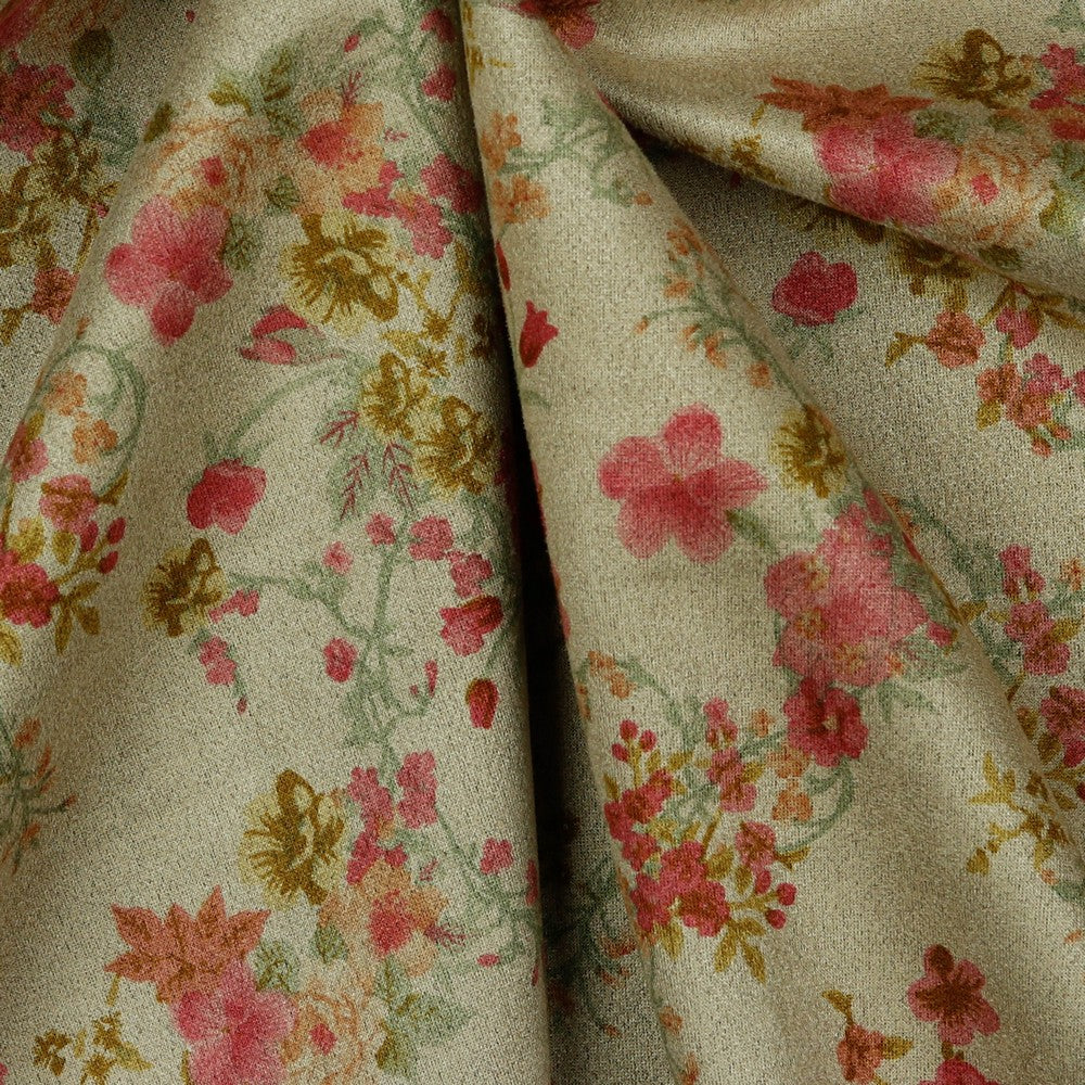Met een gewicht van 280 gr/m² heeft deze suède stof voldoende body om mooi in vorm te blijven, terwijl hij soepel en aangenaam blijft aanvoelen. De bloemenprint in zachte rood- en rozetinten geeft de stof een verfijnde en elegante uitstraling, zonder druk te ogen.