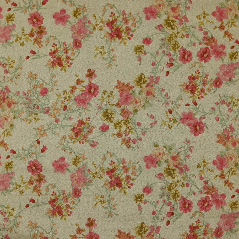 Ontdek deze prachtige suède stof met een romantische bloemenprint in zachte rood- en rozetinten op een licht zandkleurige basis. De stof heeft een trendy en vrouwelijke uitstraling en voelt heerlijk zacht aan. Dankzij het comfortabele draaggevoel is deze stof geschikt voor zowel volwassen kleding als kinderontwerpen.