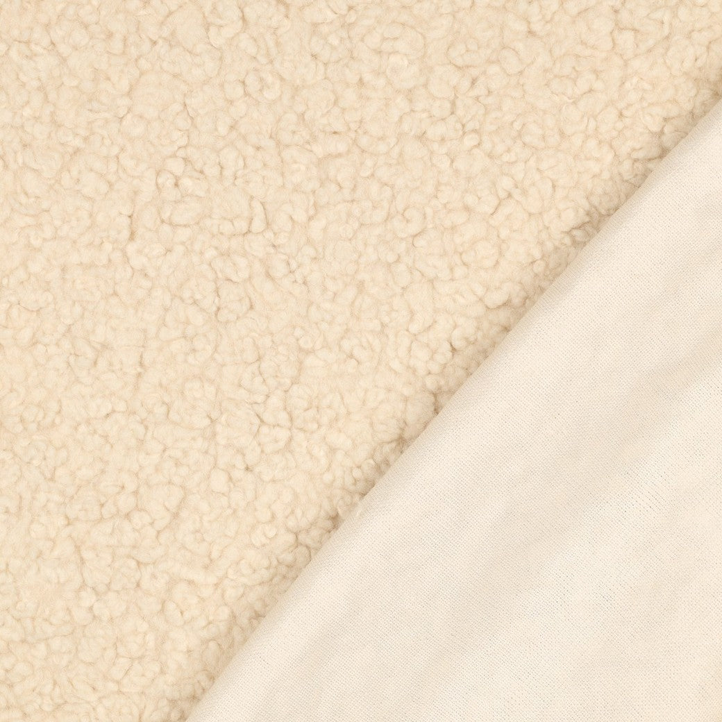 Met een gewicht van 380 gr/m² heeft deze teddy bouclé voldoende body om mooi in vorm te blijven, terwijl hij toch soepel en comfortabel blijft. De neutrale beige kleur zorgt voor een rustige, tijdloze uitstraling die gemakkelijk te combineren is.