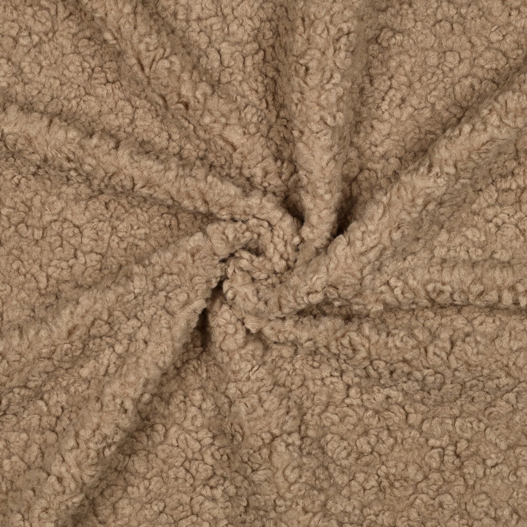 Deze soft taupe teddy bouclé stof per meter combineert een luxe zachte touch met een warme en comfortabele kwaliteit. De volle teddystructuur zorgt voor een knusse uitstraling en maakt de stof prettig om te dragen en te verwerken. Dankzij de gebreide basis heeft de stof een lichte flexibiliteit en een mooie valling.